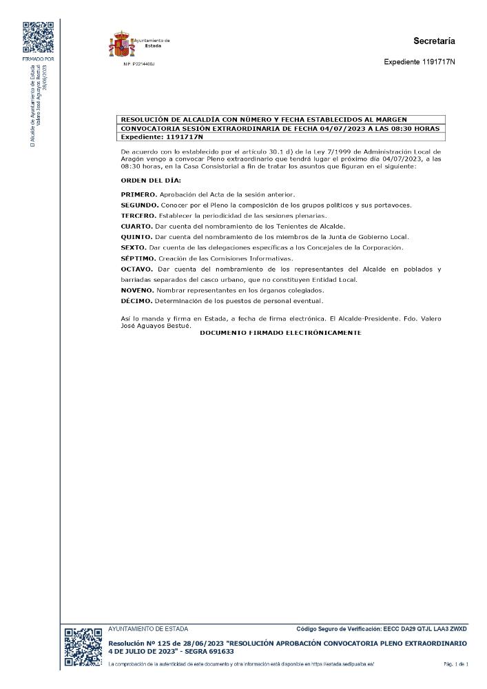 Por Resolución de la Alcaldía, se ha convocado sesión extraordinaria del Pleno Municipal, que se celebrará el día 04/07/2023 a las 08:30 horas que, según lo previsto en el Reglamento de Organización, Funcionamiento y Régimen Jurídico de las Entidades Locales, aprobado por Real Decreto 2568/1986, de 28 de noviembre, tendrá el siguiente