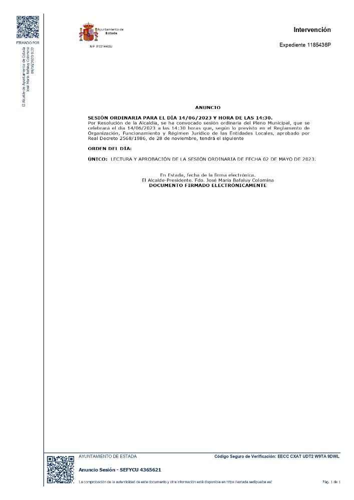CONVOCATORIA SESIÓN ORDINARIA, DÍA 14 DE JUNIO DE 2023 A LAS 14:30 HORAS. Whatsapp: CONVOCATORIA SESIÓN ORDINARIA, DÍA 14 DE JUNIO DE 2023 A LAS 14:30 HORAS. Fecha 09 junio 2023 CONVOCATORIA SESIÓN ORDINARIA, DÍA 14 DE JUNIO DE 2023 A LAS 14:30 HORAS. ORDEN DEL DÍA: ÚNICO: Lectura y aprobación de la sesión Ordinaria de fecha 02 de mayo de 2023. Galería imágenes cat: Ayuntamiento, vaobulcary: 3643583 cat: Participación ciudadana, vaobulcary: 3643583