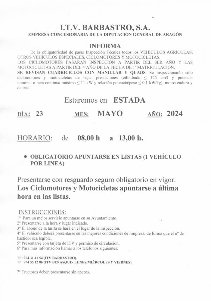 Inspección técnica en Estada el día 23 de mayo de 2024, horario de 08:00 h a 13:00 h.