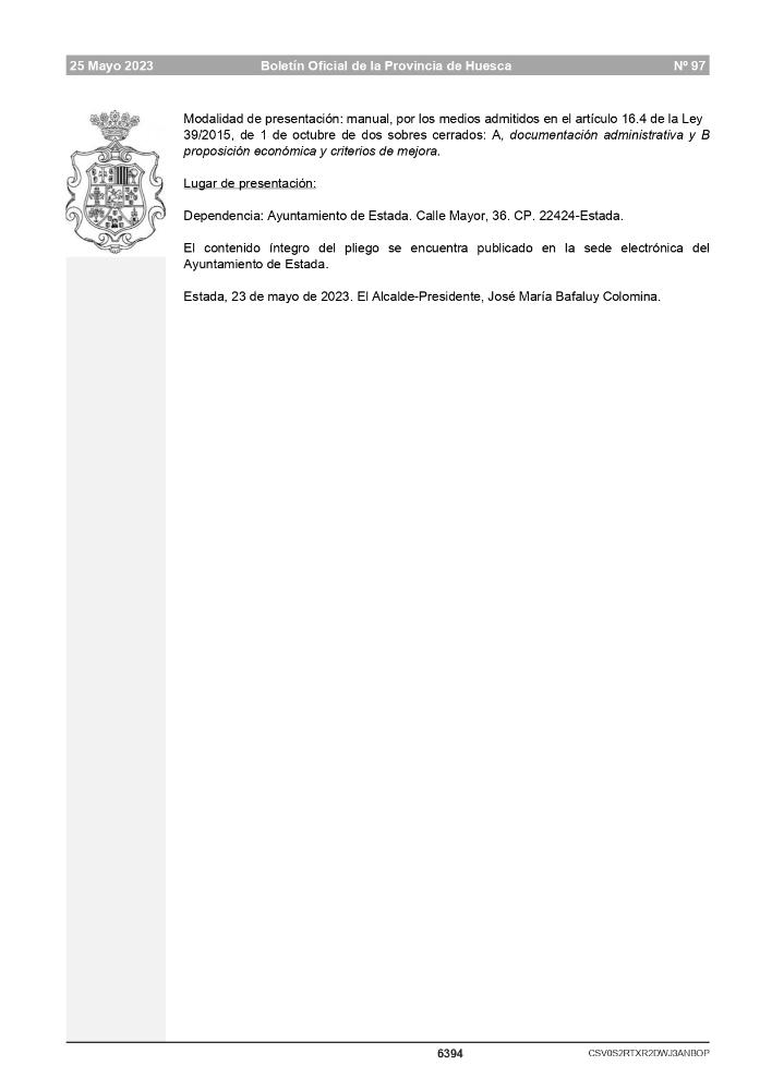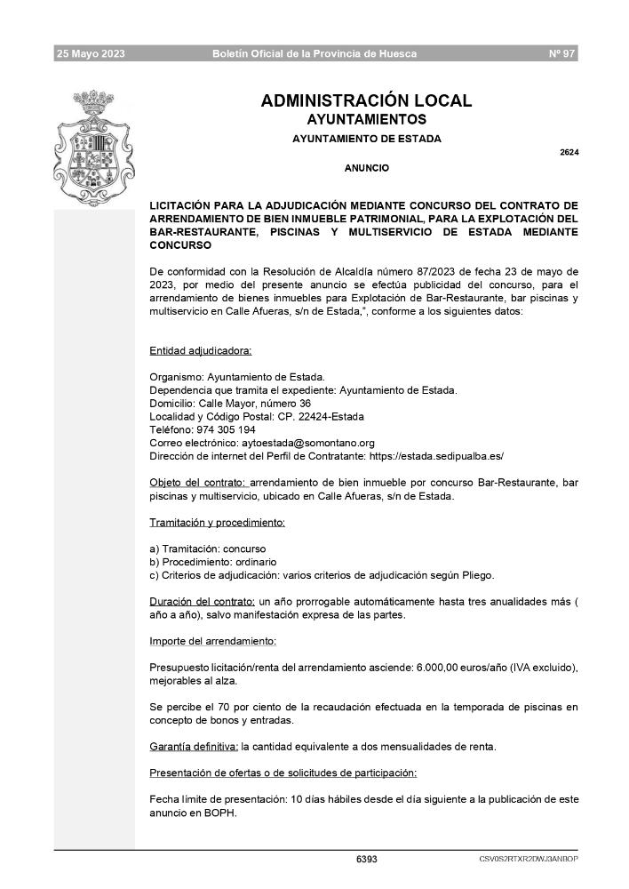 LICITIACIÓN PARA LA ADJUDICACIÓN MEDIANTE CONCURSO DE ARRENDAMIENTO BAR-RESTAURANTE, PISCINAS Y MULTISERVICIO EN ESTADA Whatsapp: LICITIACIÓN PARA LA ADJUDICACIÓN MEDIANTE CONCURSO DE ARRENDAMIENTO BAR-RESTAURANTE, PISCINAS Y MULTISERVICIO EN ESTADA Fecha 25 mayo 2023 Licitación para la adjudicación mediante concurso del contrato de arrendamiento de bien inmueble patrimonial, para la explotación del bar-restaurante, piscinas y multiservicio de Estada mediante concurso. Galería imágenes cat: Ayuntamiento, vaobulcary: 3643583 cat: Servicios, vaobulcary: 3643583
