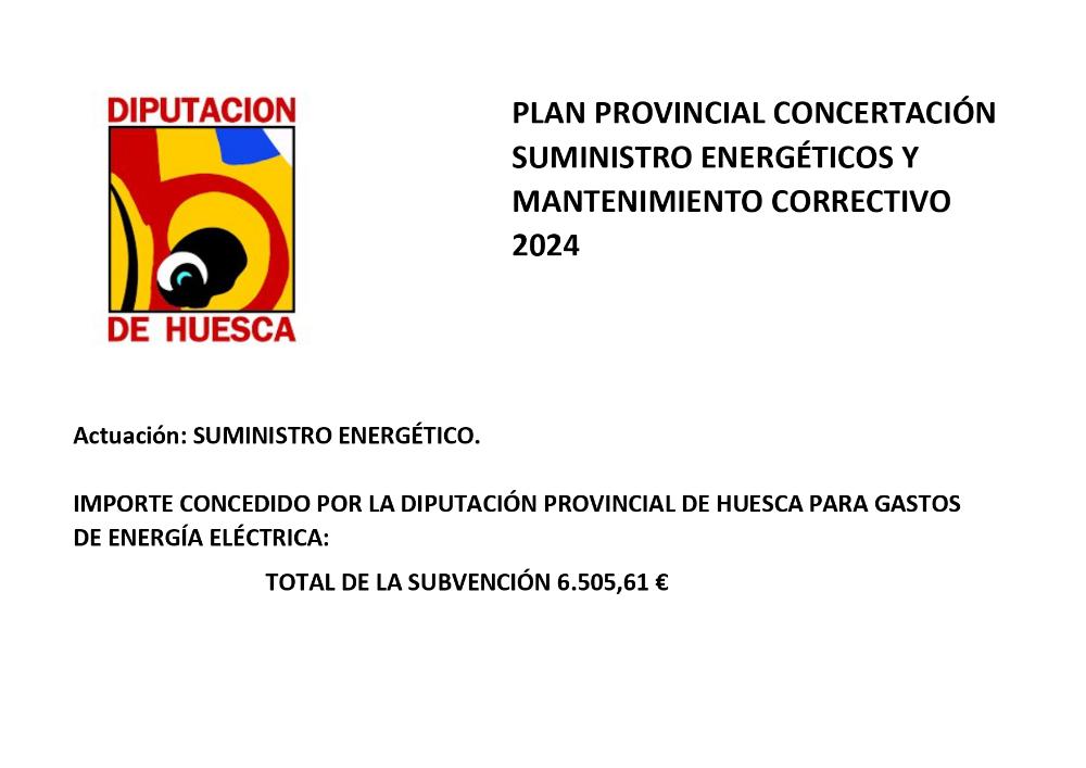 Plan de Concertación Suministro Energéticos y Mantenimiento correctivo 2024 Whatsapp: Plan de Concertación Suministro Energéticos y Mantenimiento correctivo 2024 Fecha 31 octubre 2024 Suministro energético y mantenimiento correctivo Concesión para gastos de energía eléctrica municipal por parte de la Diputación Provincial de Huesca Galería imágenes cat: Ayuntamiento, vaobulcary: 3643583 cat: Subvenciones y ayudas, vaobulcary: 3643583