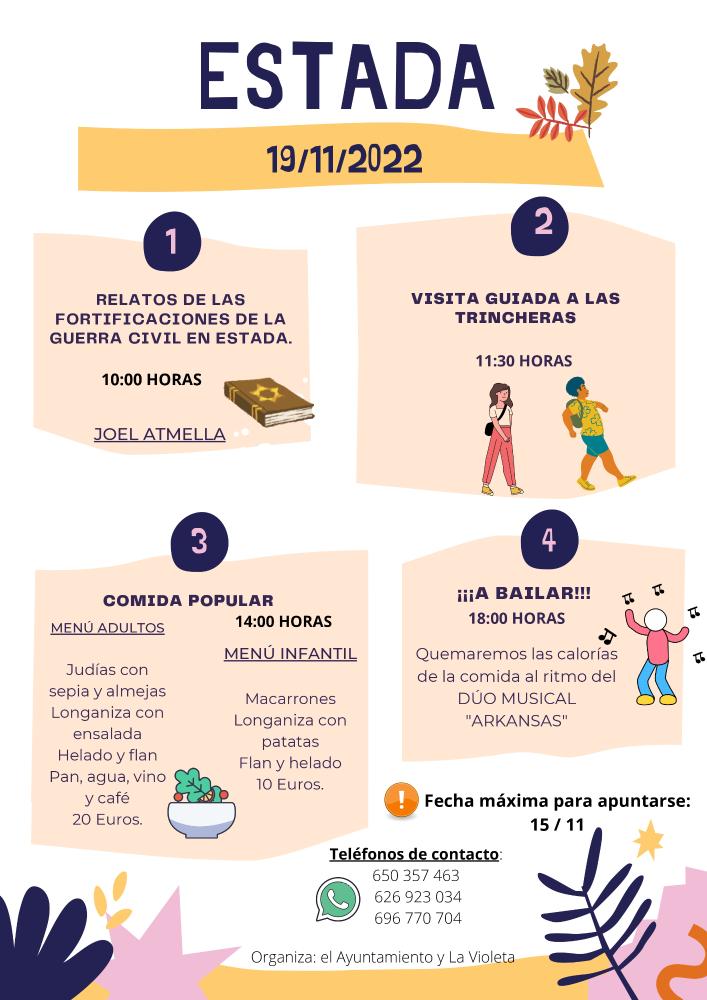 Relatos de las fortificaciones de la Guerra Civil en Estada, visita guiada a las trincheras con Joel Atmella, comida popular y baile.